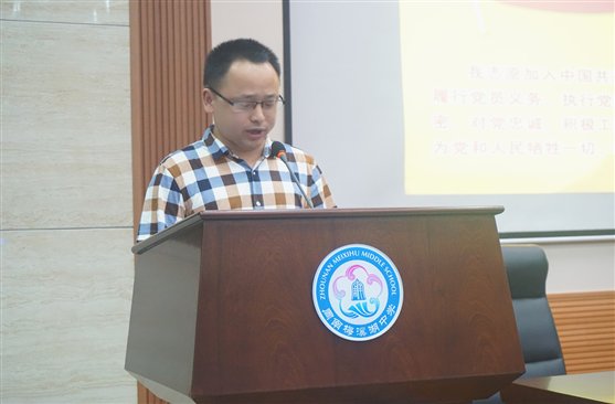 赵忠科副校长宣读了新党员名单和表彰决定,初中支部发展了一名党员,全校评选表彰了6名优秀党员和2名优秀党务工作者。王剑湘副校长带领新党员宣誓,全体党员一起重温了入党誓词,叶双秋校长为受表彰的同志颁发了荣誉证书。