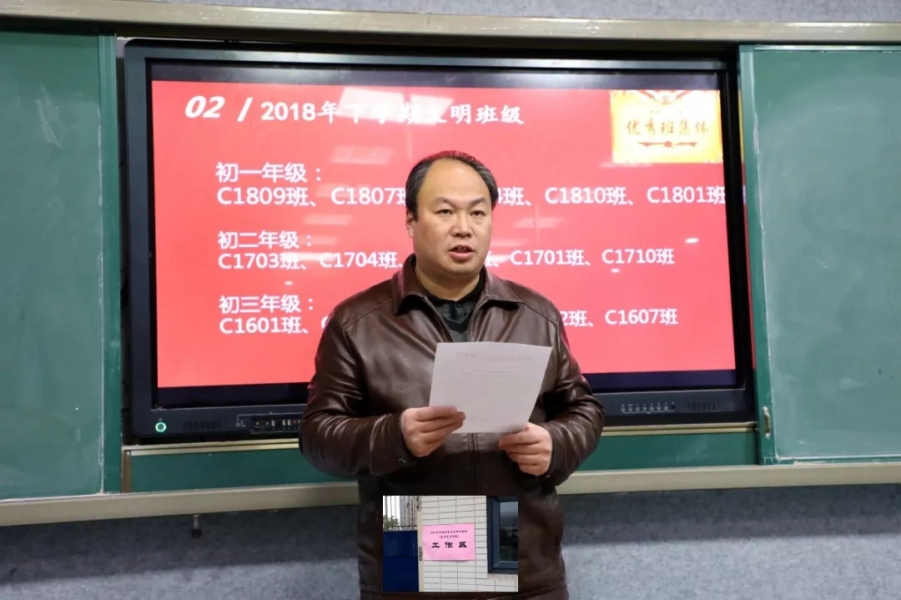 男:第二项,请曹共平书记宣读2018年下学期文明班级和优秀班主任的表彰决定。