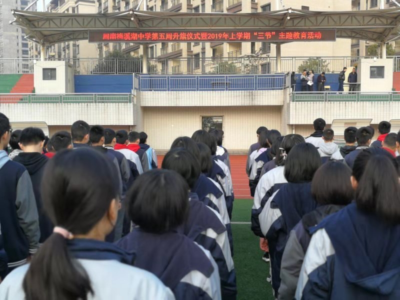 男:周南梅溪湖中学第五周升旗仪式暨2019年上学期“三节”主题教育活动,现在开始!