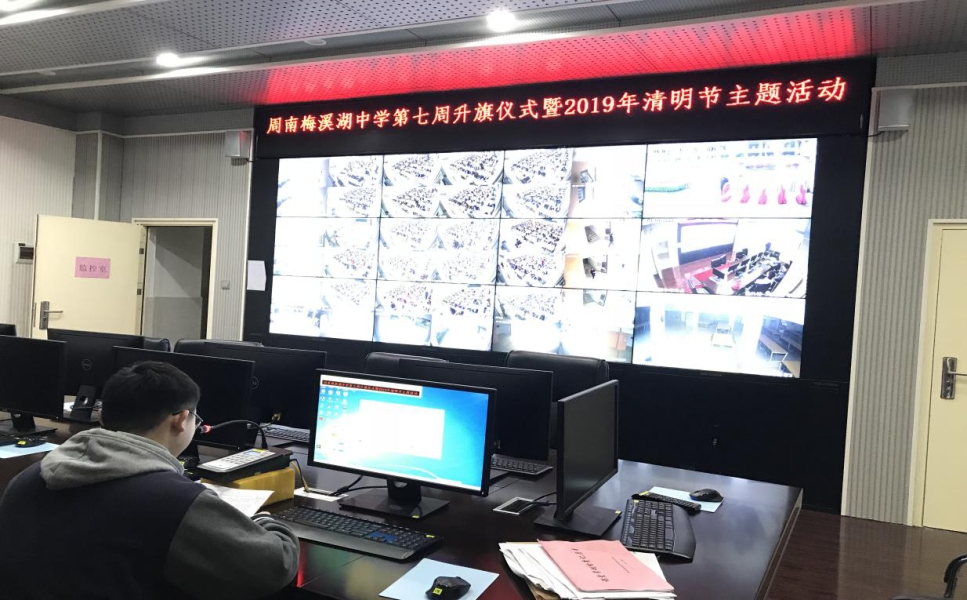 男:周南梅溪湖中学第七周升旗仪式暨2019年清明节主题活动,现在开始。