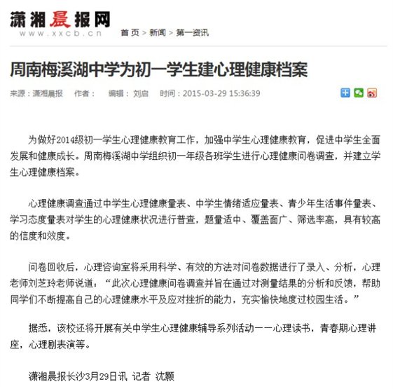 【潇湘晨报】周南梅溪湖中学为初一学生建心理健康档案 来源:周南梅溪湖中学 发布时间:2015-04-02 00:00:00 浏览次数: 次 【字体:小 大】 相关链接: 潇湘晨报:http://www.xxcb.cn/event/jishi/2015-03-29/8975598.html 分享到: 【打印正文】