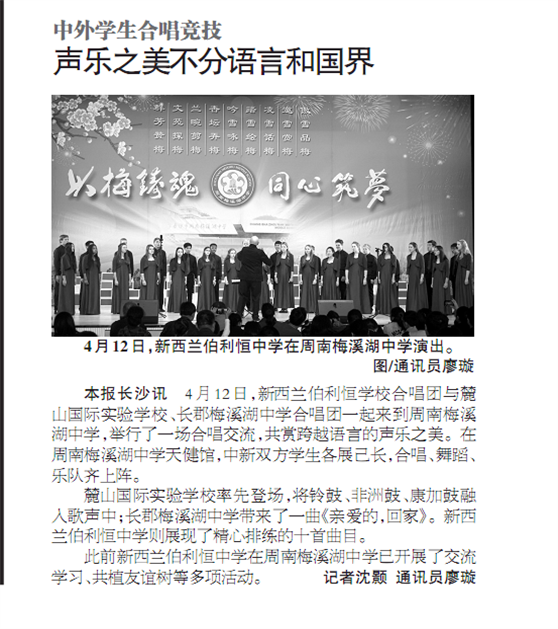 本报长沙讯 4月12日,新西兰伯利恒学校合唱团与麓山国际实验学校、长郡梅溪湖中学合唱团一起来到周南梅溪湖中学,举行了一场合唱交流,共赏跨越语言的声乐之美。在周南梅溪湖中学天健馆,中新双方学生各展己长,合唱、舞蹈、乐队齐上阵。