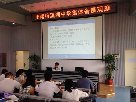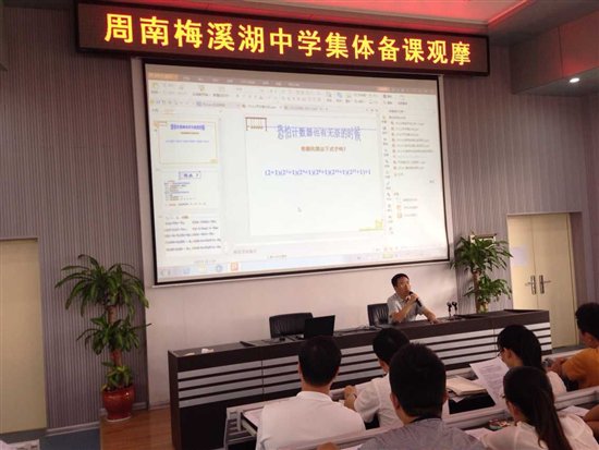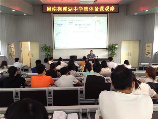 9月10日下午,周南梅溪湖中学全体语文老师以及部分其他科目的老师聚集在博学报告厅一楼,观摩了初二年级语文组的集体备课。副校长王剑湘、教务处主任宋国军到堂指导。