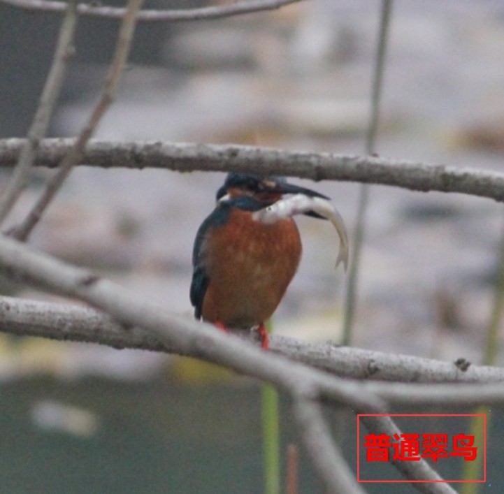 因早上比较安静,我们不到七点钟便来到了桃花岭公园观鸟。与文加质父母和班级的一些同学一起走在公园里的小路上。文加质的父亲是一位在鸟类方面知识渊博的人。他一路上告诉我们各种鸟的特征特性,如:白鹡鸰、珠颈斑鸠、翠鸟、乌鸫、白头鹎、黑脸噪鹛、黄腹山雀、大山雀、鹊鸲等,但其中是我最喜欢、最想介绍的还是翠鸟。我们在水边拍到了一只翠鸟,他当时正停在树枝上,体长十三至十四厘米,体色较淡,耳覆羽粽色,翅和尾较蓝,下体红褐色,耳背后还隐藏着一块白斑。它应该还是只亚成鸟,上身的蓝色光泽还不是太显眼,但最有趣的还是这只普通翠鸟长长的嘴里叼着一条小鱼,样子十分可爱。
