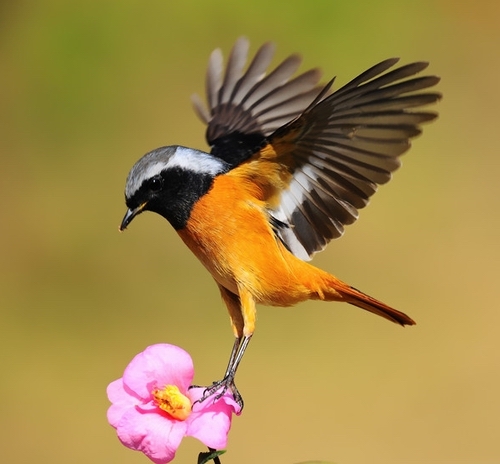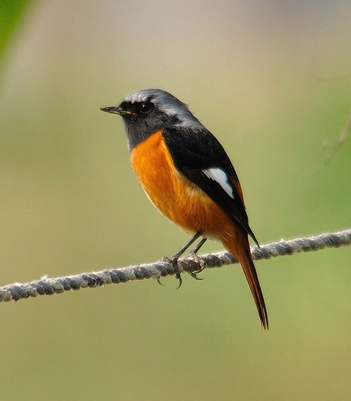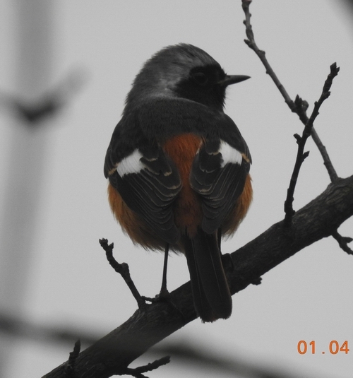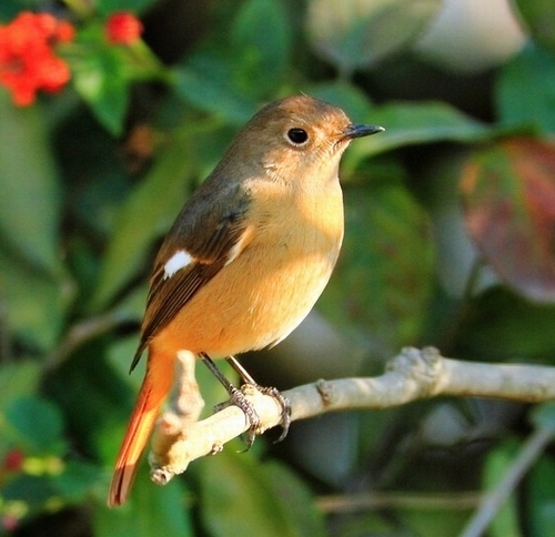 北红尾鸲(学名:Phoenicurus auroreus):是小型鸟类,体长13-15厘米。雄鸟头顶至直背石板灰色,下背和两翅黑色具明显的白色翅斑,腰、尾上覆羽和尾橙棕色,中央一对尾羽和最外侧一对尾羽黑色。前额基部、头侧、颈侧、颏喉和上胸概为黑色,其余下体橙棕色。雌鸟上体橄榄褐色,两翅黑褐色,具白斑,眼圈微白,下体暗黄褐色。相似种红腹红尾鸲,头顶至枕羽色较淡,多为灰白色,尾全为橙棕色。