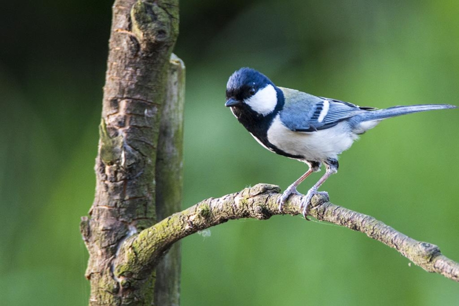 大山雀(学名:Parus major):中小型鸟类,体长13-15厘米。整个头呈黑色,头两侧各有一大型白斑,喙呈尖细状,便于捕食。上体为蓝灰色,背沾绿色。下体白色,胸、腹有一条宽阔的中央纵纹与颏、喉黑色相连。雌鸟羽色和雄鸟相似,但体色稍较暗淡,缺少光泽,腹部黑色纵纹较细。