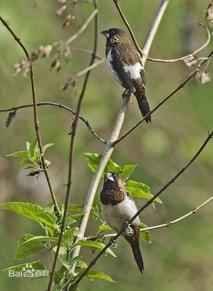 白腰文鸟(学名:Lonchura striata)是小型鸟类,体长10-12厘米。上体红褐色或暗沙褐色,具白色羽干纹,腰白色,尾上覆羽栗褐色,额、嘴基、眼先、颏、喉黑褐色,颈侧和上胸栗色具浅黄色羽干纹和羽缘,下胸和腹近白色,各羽具“U”形纹。相似种斑文鸟,腰不为白色,羽色亦不同。