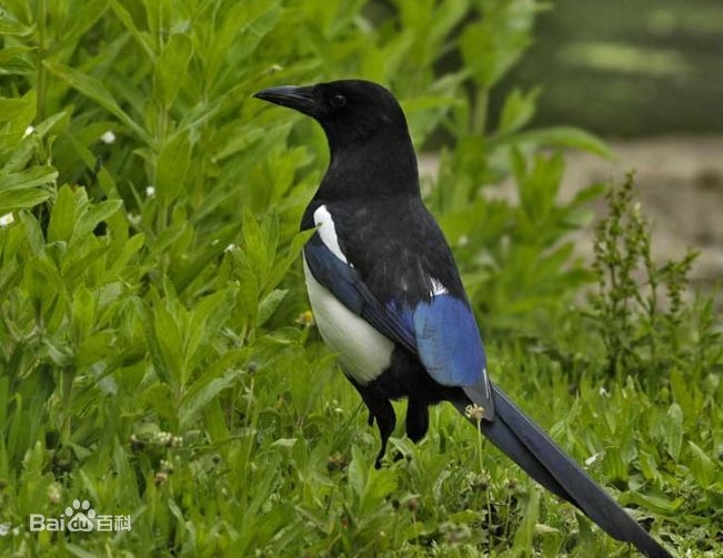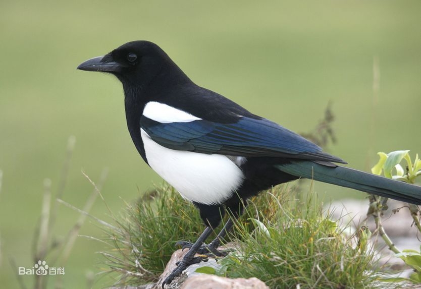 喜鹊(学名:Pica pica)是鸟纲鸦科的一种鸟类。体长40-50厘米,雌雄羽色相似,头、颈、背至尾均为黑色,并自前往后分别呈现紫色、绿蓝色、绿色等光泽,双翅黑色,翼肩有一大形白斑,尾比翅长,呈楔形,嘴、腿、脚纯黑色,腹面以胸为界,前黑后白。虹膜暗褐色;嘴、跗蹠和趾均黑色。