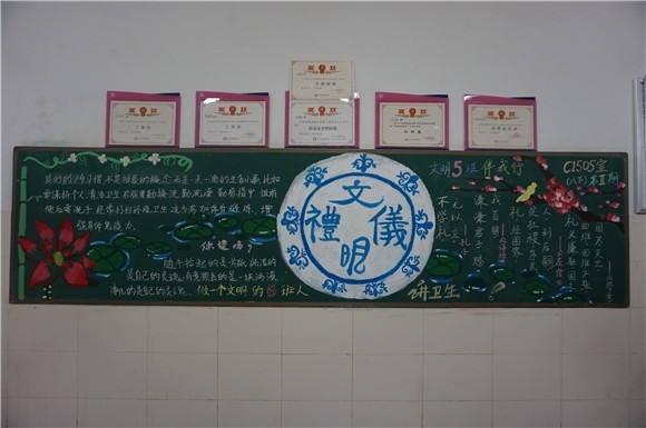 此次主题黑板报评比活动受到全体学生及老师的重视。学生精心策划、编排的板报内容涉及卫生拍手歌、卫生小知识、文明守则、文明倡议书等。板报的构思、设计、排版、抄写、美化及色彩搭配,无不体现了学生的聪明才智。面对独具匠心、异彩纷呈、图文并茂的板报设计作品,同学们更加全面地学习了文明礼仪知识,了解了卫生文明的重要性,有力地推动了和谐校园、文明班级的创建工作。