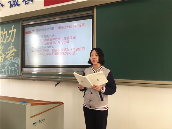 接着,各班的生物老师和地理老师走上讲台与家长沟通,列出了具体的复习方案,并提出希望:一是各位家长督促孩子养成课前预习,课堂积极发言,课后及时复习的好习惯。多与孩子沟通,及时了解孩子的生地学习情况;二是要家长配合老师的复习计划和孩子一起制定会考目标,使孩子学习获得动力,明确努力的方向;三是希望家长能针对自己孩子的具体情况指导他们制定复习计划,并进行落实。