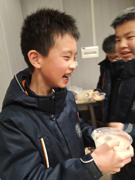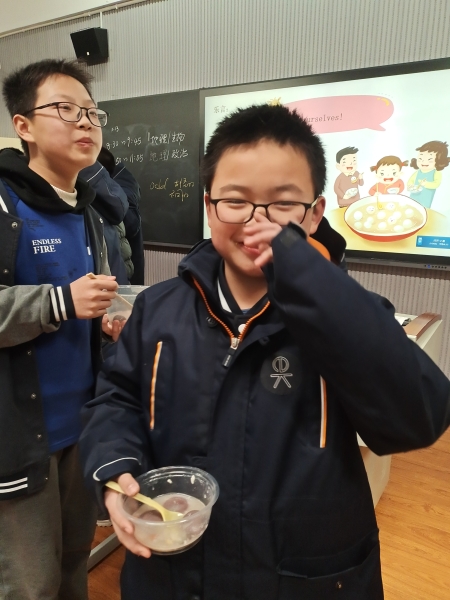 “吃汤圆了——”暖暖的,甜甜的汤圆,幸福感爆棚啊!我们进入了“乐享”时光。没一会,每个人的碗里都装着元宵,每个人的脸上都挂着可人的笑容。一边品尝汤圆甜甜,一边思考着藏在同学们自制红包灯笼里面刘老师准备的灯谜,有的两人在一起细细研究,有的三五成群在一起讨论,有的看着谜面陷入沉思,用心思考着谜底,有的则反应迅速,很快便猜出谜底,呈现出一片热闹的景象。答对了灯谜还有小礼物哦,太棒了吧!