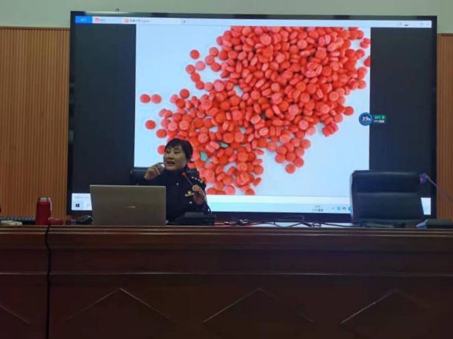 首先,方鸿雁警官通过图片展现的方式向同学们介绍了什么是毒品,常见毒品以及新型毒品的种类,并通过互动抢答的形式增强同学们对禁毒知识的学习兴趣,讲座现场气氛热烈,同学们参与度非常高。