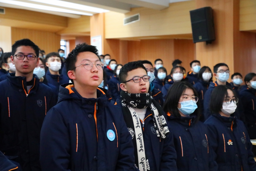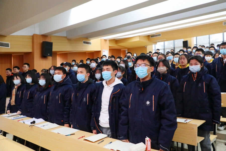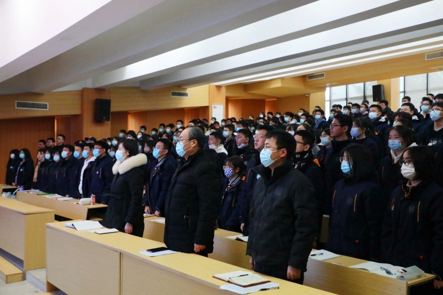 开班仪式开始,全体起立,奏唱国歌、校歌。现场歌声嘹亮,激情昂扬。