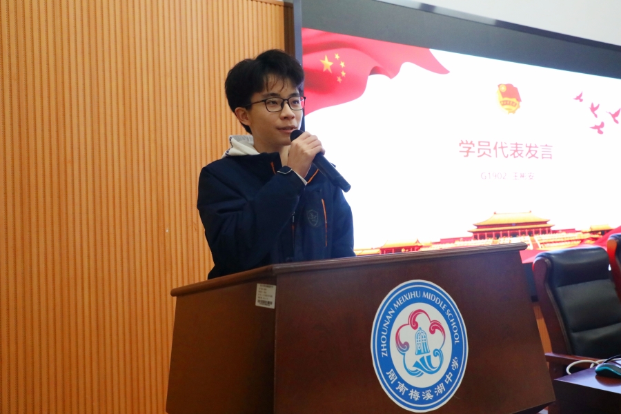 会议第四项,学员代表G1902团支部王彬安同学发言。王彬安同学自豪地说:“中国共产主义青年团是中国共产党领导的先进青年群众组织,是广大青年在实践中学习中国特色社会主义和共产主义的学习,是中国共产党的助手和后备军。与团组织一起,我们可以提升个人综合能力,在实践与学习中进步,在集体中发展提升,共青团更为我们提供了一个奉献自己,报效社会的机会。”