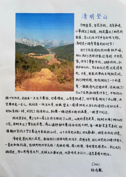 C2001班陈鸿霖感慨道:“清明节是我们寄托哀思,激励我们继续向前的日子。疫情当前,我们在党的正确领导下,一直在积极抗疫,也顺利地攻坚克难!民族的魂,感人的情,清明寄思感恩心,牢记先烈辉煌史,用心用情思先烈,民族文化要发扬,优秀传统永记心,追思真情天地证。”