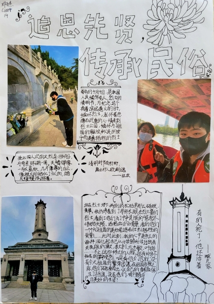 本次活动,同学们或缅怀先人以寄托哀思,或制作青团与家人共享,或踏青郊游感受春光,拍下活动照片,珍藏美好瞬间。通过演绎民俗文化、纪念先祖烈士、拓展节日文明等方式,学生们感受到中华民族文化的丰富内涵,增强了学生对先辈们的崇敬以及对生命的敬畏之情。
