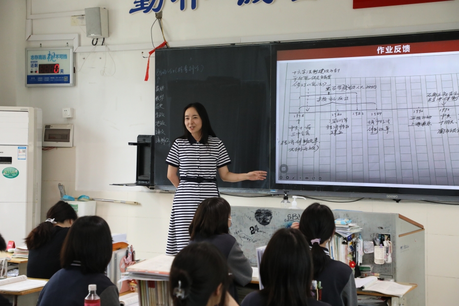 高三历史备课组长匡林林老师呈现了《二轮复习改革开放后的现代中国(1978年至今)》一课,匡老师结合近年来高考动向和学生实际情况,对课堂内容进行了有针对的布局,从向内看,看改革与开放的联系;向前看,对比近代和现代的开放;向外看,看改革开放三个层次层层递进。课堂中,匡老师从展示学生自制时间轴入手,通过学生对时间轴的讲解理清基本史实以及史实之间的联系和阶段总特征。再聚焦核心考点,把核心知识与高考真题训练相结合,让学生在实践中理解内化知识,训练思维能力,提升解题能力和核心素养。