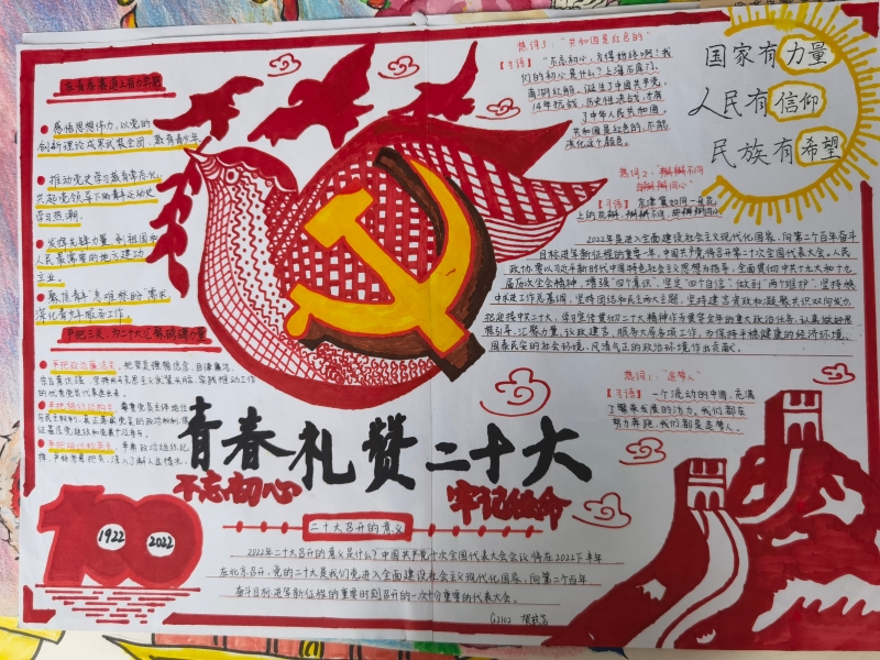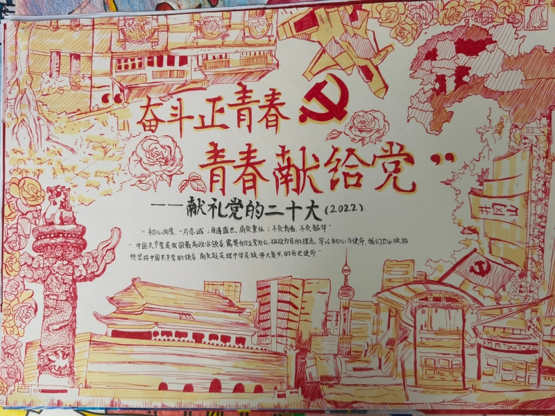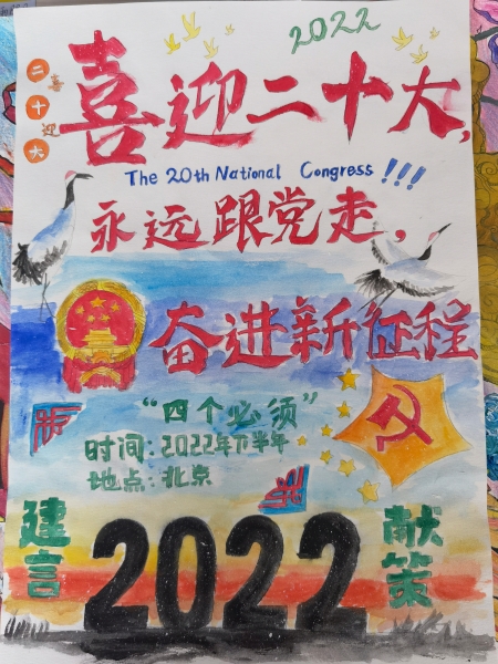 今年,中国共产党将召开第二十次全国代表大会,这是包括广大青少年在内的全党全国各族人民政治生活中的一件大事。今年,恰逢共青团成立100周年,团结引领广大青少年,紧跟党步伐、建功新时代,是迎接党二十大的最好方式。为进一步丰富校园生活,展示广大学子奋发有为的青春风貌,我校高一政治组组织开展了以“奋斗正青春,青春献给党——献礼党的二十大”海报手抄报设计大赛。