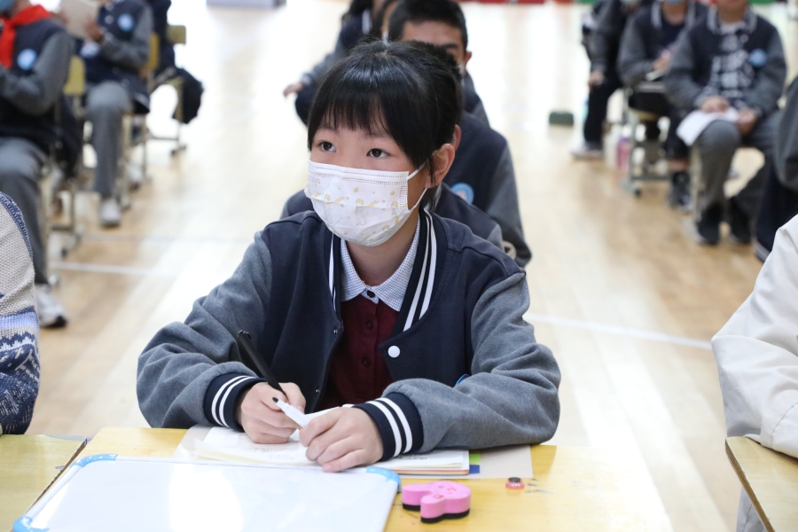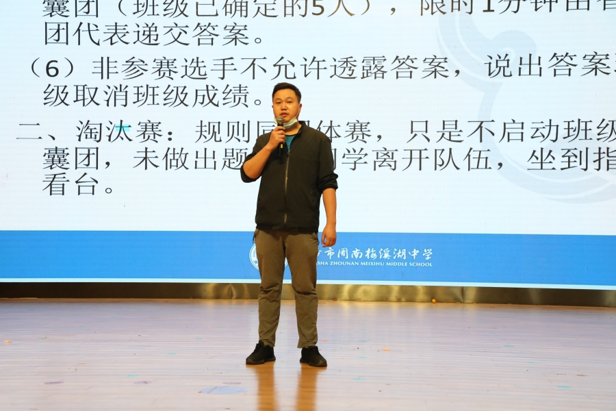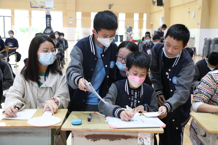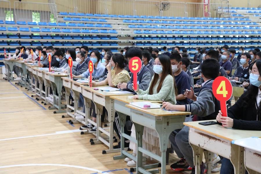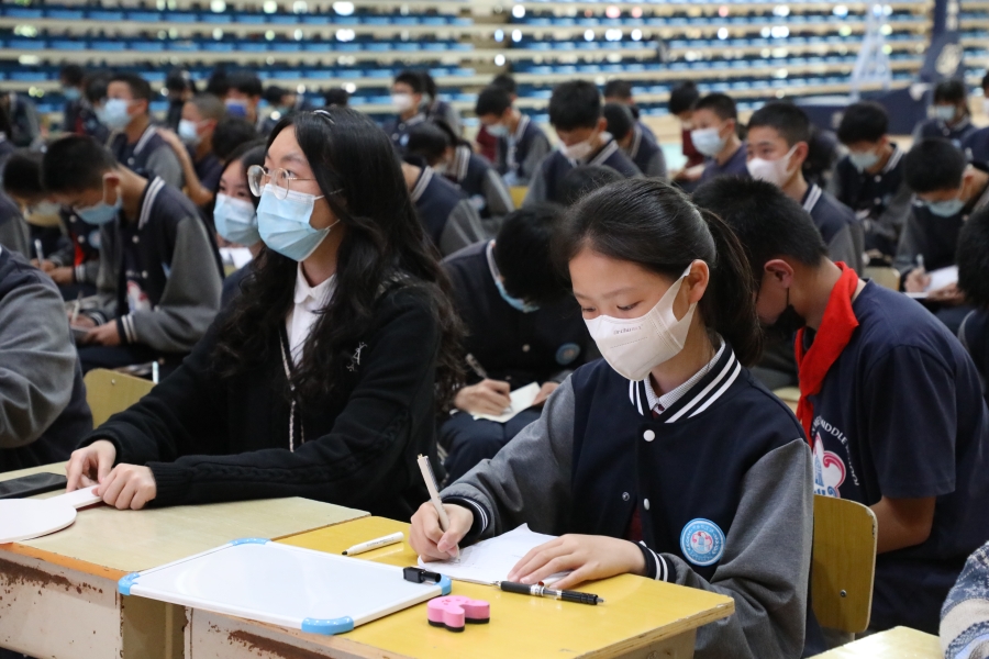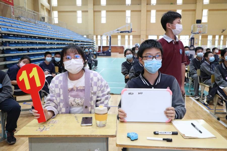 5月17日下午4点,决赛正式拉开帷幕,60名学生参赛选手与60名“智囊团”齐聚天健馆。参赛选手依据出题老师的要求,迅速在白板上写下答案并在限定时间出示答案,各评委老师现场审核答案并举牌,其余学生在班级教室通过直播观赛。