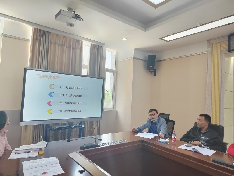 一人难挑千斤担,众人能移万座山。各备课组长率先对接下来的二十天备考分别做了详尽的规划和具体的方法介绍。语文备课组长付敏老师总结归纳出了语文备考的六条原则:自查自纠找到自身问题,思维导图汇总知识点和答题技巧、高考真题辨明方向、微型强化训练查漏补缺、作文复习团结分工协作。数学备课组长张鹏老师从微专题、短卷训练和保温训练三个方面,对晚上和白天进行明确分工,力求分阶段实现小题、前四道大题和后两道大题第一问得分率的新突破。英语备课组长欧小华老师以时间为轴,计划分阶段实现词和句篇的背记,并以真题为依据做好专题复习的查漏补缺工作。物理备课组长向子柚老师从微专题、小题训练、考前保温和心态调试四个方面介绍了物理组的备考策略和方法。化学备课组长谭志刚老师主张从微专题、不定向选择题、回归教材和构建答题模板四个方面进行最后二十天的针对性训练。生物备课组长张序贵老师针对目前学生基础不扎实、审题不仔细、推导不严谨和答题不规范的问题,建议后阶段实行基础知识背记过关、推行错题重做、进行培优辅差和保温训练。政治备课组长黄锋强老师抓住变与不变这条主线,指出最后冲刺阶段应该研究高考真题及高考评分细则,培养和提高学生解答主观题的能力,并结合最热的问题和最新的试题进行巩固训练,最后回归教材落实基础,进行保温训练。历史备课组长匡林林老师认为最后二十天首先应牢记基础知识,其次是解题方法的归拢,最后是对学情诊断再优化。地理备课组长朱美珍老师提出首先通过微专题落实基础知识,其次进行限时训练进行高考心理适应,最后进行真题卷和四大名校模拟卷训练,总结做题技巧。