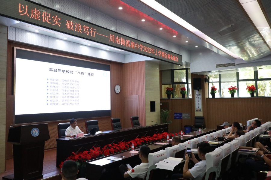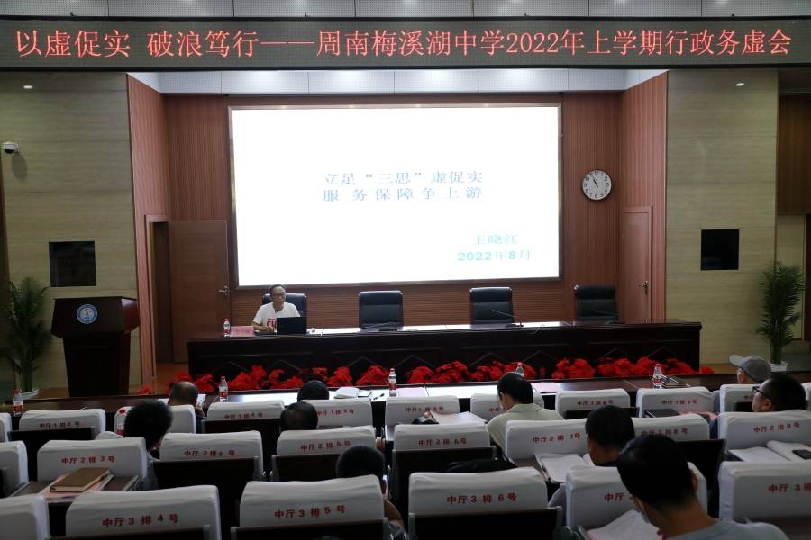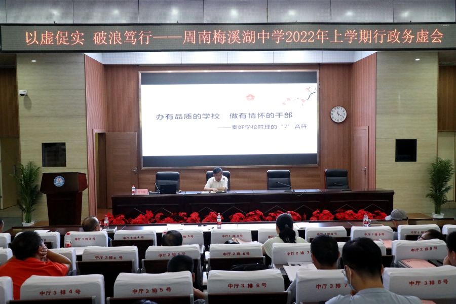 为进一步提升行政干部执行力和业务素养,全面促进学校发展,2022年8月12日,周南梅溪湖中学在笃行报告厅①召开了2022年上学期行政务虚会议。学校校长叶双秋、党委书记曹共平、副校长王晓红及全体中层干部参加会议。
