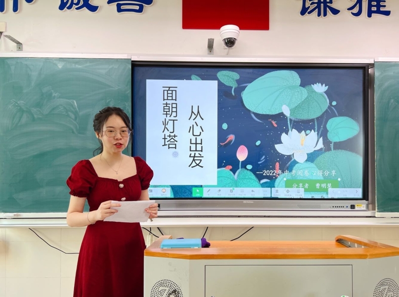 曹明慧老师以“面朝灯塔,从心出发”为主题,从阅卷过程、心得体会、反思复习分享了2022年中考阅卷体会,重点注意全局观、时空观、责任感。反思再复习阶段引导学生多角度审题,思维导图列提纲,精选语块和佳句欣赏并仿写,誊写文章重格式。