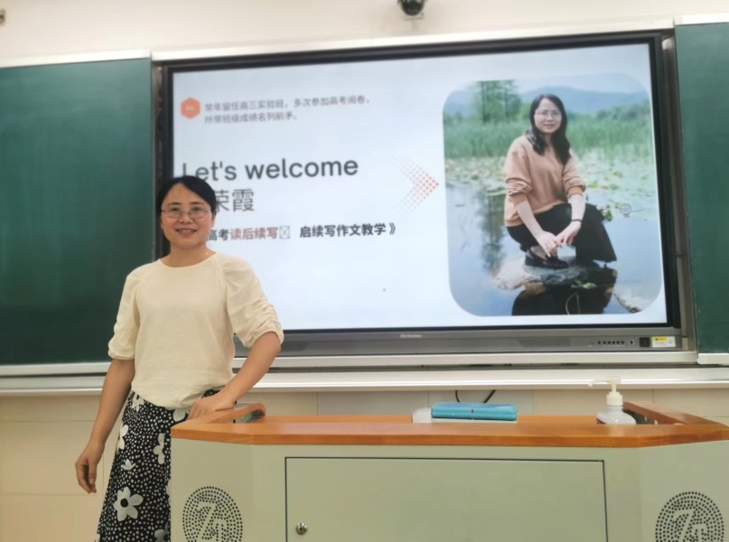 谢荣霞老师以“阅高考读后续写,启续写作文教学”为题,从高考试题分析、阅卷标准、答题情况及教学启示四方面为老师们详细介绍了高考阅卷的心得体会。同时,谢老师从评分角度给出读后续写教学建议:首先,培养学生分析情境语境、理解文化差异的能力;其次,提高学生抓住篇章显性逻辑的意识;再者,注重学生积累、模仿、创作,以促进语言协同;最后,要求学生使用规范的标点及书写。谢老师的分享,为老师们解答了如何在常规中寻求教学成果突破,真正落实学生科学核心素养。