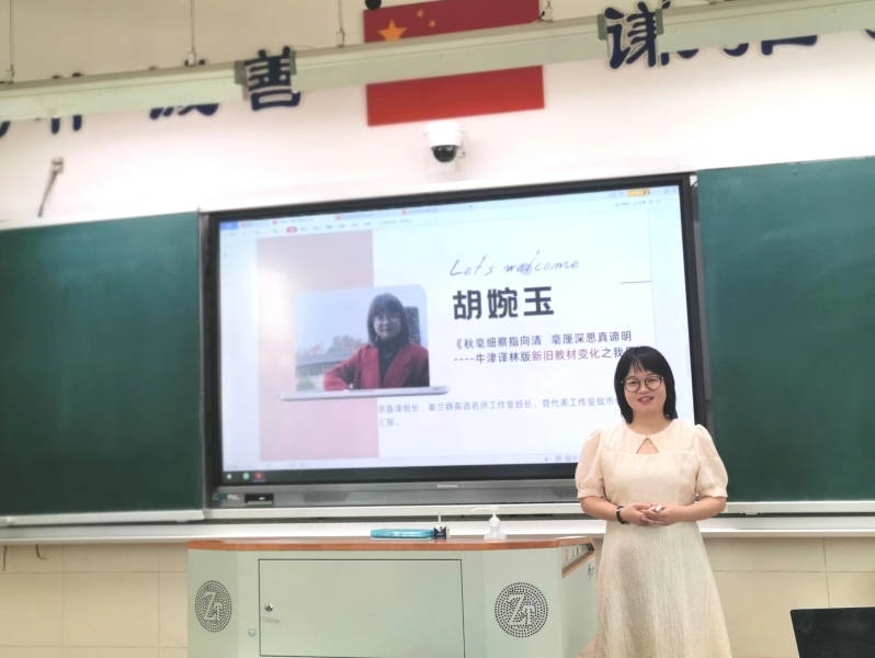 胡婉玉老师以“秋毫细查指向清,毫厘深思真谛明”为题,专业、细致地从五个方面,为全体老师解读了牛津译林版新旧教材的变化:第一,整体编排之变;第二,主题语境的突出;第三,地道表达的增加;第四,中国元素比例的增加;第五,文学性语篇比例的增加。胡老师将这五大变化追根溯源,在《新课程标准》中找到其依据,并给出具体的教学建议。