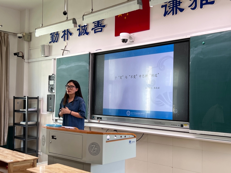 麻庭滋老师率先做了以“于‘变’与‘不变’中思辨‘附近’”为主题的新课标研读心得分享。她从新课标的“变”与“不变”、在新课程实践中思辨“附近”两个方面进行解读,引用经典书籍、时政热点以及自己的亲身经历,深入浅出讲述了她对于新课标的见解与研读体会,也提出了自己对于新课程内容创新的设想。