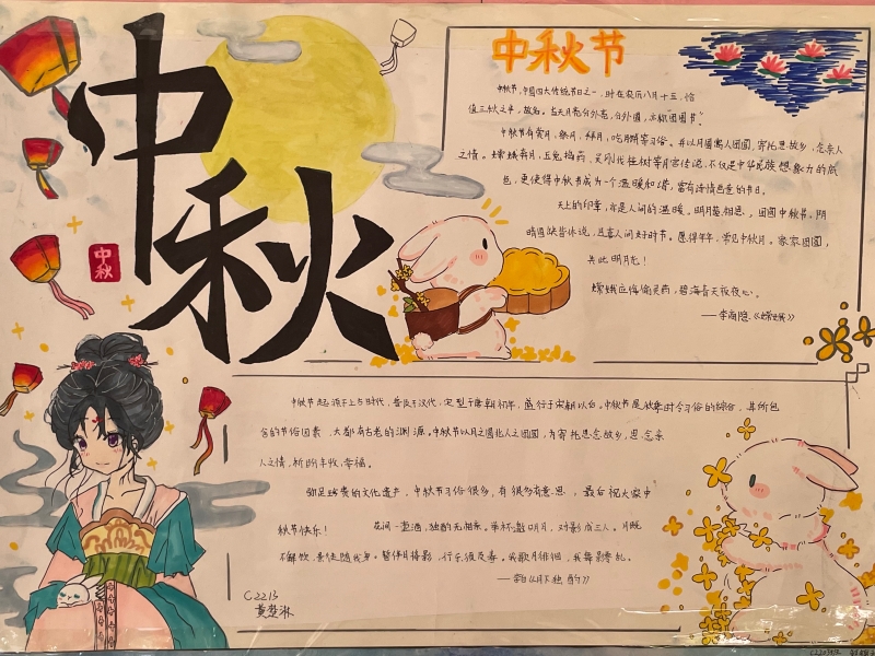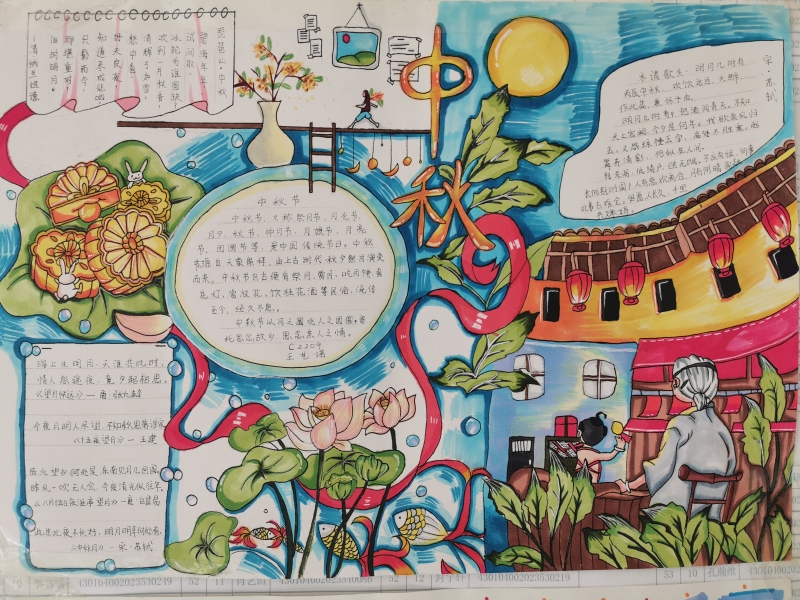 (通讯员 邹胜蓝)又到一年中秋,暑热消退,桂影婆娑,暗香袭来,舒适的气候烘托着节日的欢乐气氛,团圆、祝福、欢聚是中秋永恒的主题。中秋佳节到来之际,周南梅溪湖中学初一年级的同学们制作了一张张精美的手抄报,迎接中秋节的到来。