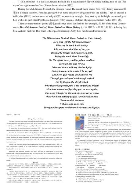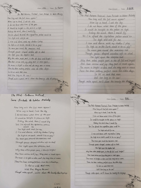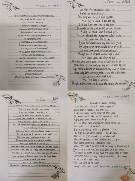 中秋之际,要求学生诵读神话故事英文版《嫦娥奔月》,赏析许渊冲英译版《水调歌头》 “Prelude to Water Melody”,并以规范工整的字体将中外诗句写于古色古香的笺纸之上,不同于笔锋遒劲的楷书,英语的书写体别具风采,同学们对字体圆润饱满度,字母的高度、大小、间距等都可谓是精雕细琢,一幅幅佳作跃然纸上,令人观赏之后耳目一新。