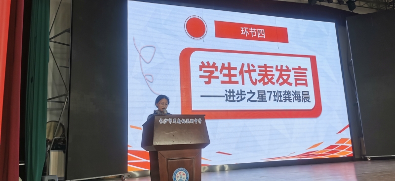 大会第四项,进步之星代表C2007班龚海晨发言。她给同学们提出了三点建议:第一,重视错题。错题就是学习中的一面镜子,它们反映着学习中我们薄弱的知识点;第二,对试卷做好分析与总结,无论成绩的好坏,在试卷中永远有着我们仍需完善的地方,我们可以依照小题分,将我们所丢的分归纳出共同点;第三,及时找老师面批和交流。最后,她提出希望同学们在接下来的学习生活中,以学识为底气,以不畏失败的心态为勇气,在风雨中勇敢追逐梦想,在失败中成长,走向成功。