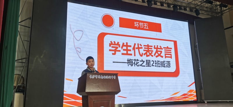 大会第五项,梅花之星代表C2002班臧源发言。臧源同学作为年级第一名,毫无保留得对同学们做了经验分享,他的自信幽默、大方得体深深吸引着全体同学。他的分享主题是“当幸福来敲门”。只要我们足够努力,每个人都有幸福来敲门的时候。