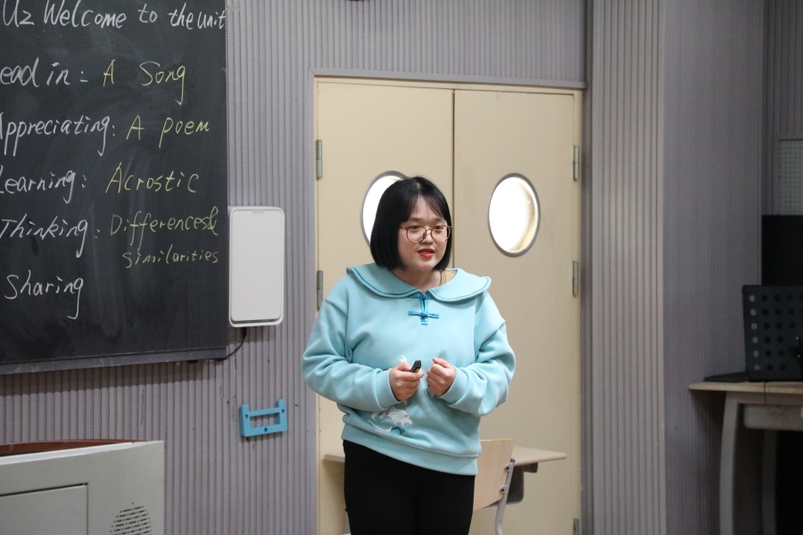 雷娟老师最后鼓励学生用藏头诗写“THANK YOU”,写下感恩的话,是学生迁移创新的典型教学实例。