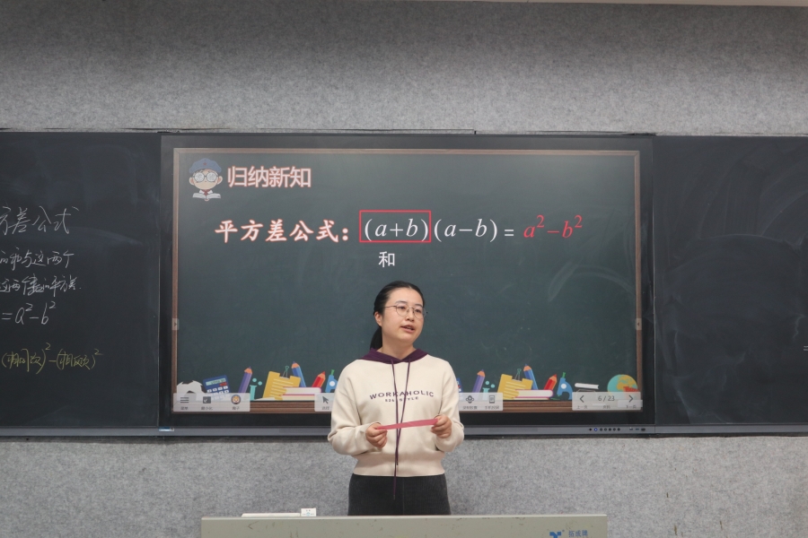康老师由买苹果的生活实例引入本节课主题,先从数的角度利用多项式乘以多项式的运算法则进行探索,再从形的角度利用几何图形的面积进一步探究平方差公式的产生,以此让学生体会数形结合的数学美。接着以小组讨论总结的形式,进一步培养学生的归纳及表达能力,发展学生的符号感和推理能力。通过分析平方差公式的结构特征,让学生熟记公式并运用公式进行计算。