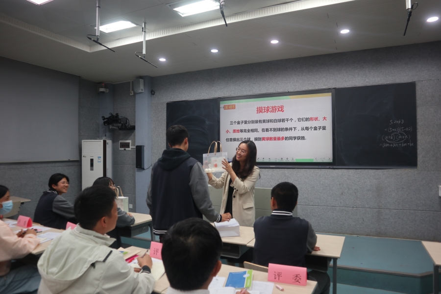 王媚老师利用精彩的视频,吸引了大家的注意力,引导出概率事件,同时又进行了学生盲盒摸球的游戏,在应用中进一步感受概率的意义,通过学生动手解决问题,观察、分析、评价解题方法获得新知。